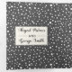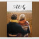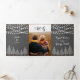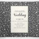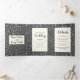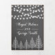 Árboles y luces de cuerdas en la boda rústica de madera gris de invierno triple pliegue. Cuenta con árboles blancos y luces de cuerda sobre madera gris en la cubierta y la solapa exterior. El interior incluye tu texto en marcos con un patrón de copos de nieve a su alrededor, mientras que la parte posterior externa sostiene la foto y las iniciales de la pareja.