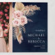 Sorprende a tus invitados con esta elegante invitación de boda con hermosas flores rosadas polvorientas y pasto de pampas secas sobre un fondo azul marino. Simplemente agregue los detalles de su evento en esta plantilla fácil de usar y adorne esta tarjeta con sus fotos favoritas para convertirla en una invitación única y personalizada.