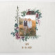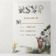 Invitaciones plegables triples de boda de acuarela en bosque que incluyen tarjetas de respuesta RSVP, detalles e información y una foto de la pareja. Características ciervo macho, bosque de pinos, ramos de flores y fuentes decoradas. ¡Genial para una boda al aire libre, en el bosque o en la montaña!