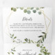 Esta invitación geométrica de oro verde eucalipto a una boda triplia es perfecta para un simple boda. El diseño está decorado con hermosas hojas verdes pintadas a mano, adornando un marco geométrico dorado.