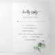 Elegante tarjeta de invitación a tres veces para bodas de eucalipto foliage geométrico todo en uno que puede personalizar con los detalles de su boda haciendo clic en el botón "Personalizar". Presenta una tipografía popular moderna con texto de guión en negro sobre fondo blanco TIP: productos de coincidencia disponibles a continuación para su comodidad