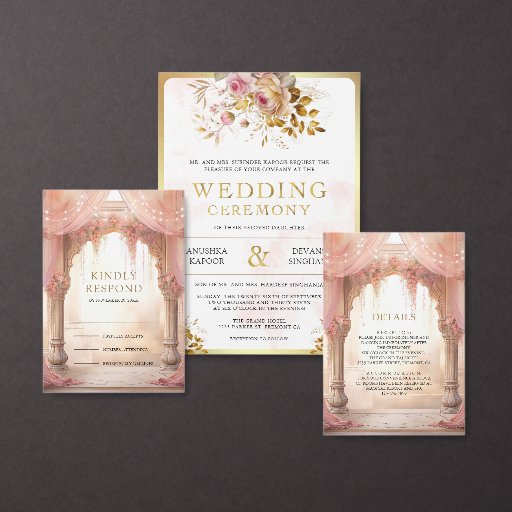 Sorprenda a sus invitados con esta elegante invitación de una boda india, con bellos arcos decorados con cortinas y flores rosas. Tipografía moderna de oro con código QR para RSVP en línea. Simplemente agregue los detalles de su evento en esta plantilla fácil de usar y adorne esta tarjeta con su foto favorita para convertirla en una invitación única.