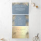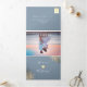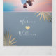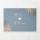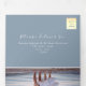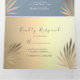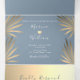 Sencilla, moderna, tropical, invitacion de boda de verano en la playa con polvo azul 3 en 1, con hojas de palma doradas y foto de la pareja.