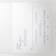 Invitación a una boda triplemente violeta/lavanda moderna con un diseño sencillo y mínimo, con el nombre de la novia en un guión elegante y el nombre del novio en una fuente contemporánea sans serif. Debajo, en la esquina inferior derecha, están los detalles de los eventos en un diseño minimalista. El panel intermedio tiene su foto favorita, el panel derecho es su tarjeta RSVP y la parte posterior tiene sus detalles adicionales.