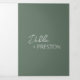 Invitación a una boda de tres veces verde oliva / verde sabio con un diseño sencillo y mínimo, con el nombre de la novia en un guión elegante y el nombre del novio en una fuente contemporánea sans serif. Debajo, en la esquina inferior derecha, están los detalles de los eventos en un diseño minimalista. El panel intermedio tiene su foto favorita, el panel derecho es su tarjeta RSVP y la parte posterior tiene sus detalles adicionales.