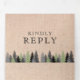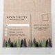 Sorprenda a sus huéspedes con esta rústica invitación a una boda temática de montaña con hermosas montañas nevadas y pinos sobre un fondo de arpillera con una tarjeta postal RSVP desmontable. Simplemente agregue los detalles de su evento en esta plantilla fácil de usar y adorne esta tarjeta con sus fotos favoritas para convertirla en una invitación única.
