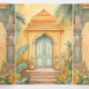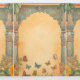 Sorprende a tus invitados con esta elegante invitación de boda con tema del sur de la India con hermosas columnas tradicionales y elementos arquitectónicos vintage decorados con flores de marigold y hojas de plátano.