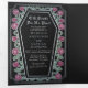 Haz una declaración audaz de amor eterno. Esta invitación gótica a la boda muestra ‘Hasta la muerte nos hace parte’ en un marco en forma de ataúd, adornado con espinas, rosas y acentos plateados contra un fondo negro con tu propio código QR. ¡Perfecto para una celebración romántica! Personalice el texto, la fuente y el color de fondo para que se ajusten a sus preferencias de diseño. Artículos coincidentes en nuestra tienda para un tema fiesta completo. Tenga en cuenta que la plata de la invitación NO es un Relieve metalizado real y está impresa en colores planos