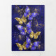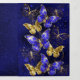Composición de lujosas mariposas de zafiro y joyas de oro sobre fondo de textura azul.