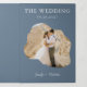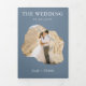 Un diseño elegante y moderno, todo en una sola invitación a la boda, con una tipografía minimalista limpia y un sofisticado color azul polvoriento. El diseño incorpora tres fotos, opciones de RSVP, detalles de eventos, sitio web boda y código QR para una accesibilidad perfecta, todo ello decorado con caligrafía moderna y moderna.
