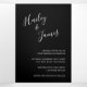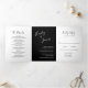 Invitación a una boda con foto triple con un diseño sencillo y moderno con sus nombres en un guión elegante escrito a mano y los detalles de su evento en línea recta. El reverso de la invitación y la portada tienen cada uno una foto. Todos los elementos de diseño están en blanco y negro y pueden cambiarse en la herramienta de edición de diseño. La letra a mano de moda añade un toque romántico a este diseño minimalista.