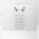 Un diseño elegante y minimalista con ramas de eucalipto ilustraciones formando un escudo que rodea su monograma. Esta invitación sustentable "todo en uno" te ahorraría dinero, no hay necesidad de incluir sobres RSVP, tus invitados cortarán el último panel y te lo enviarán de vuelta como postal.