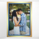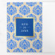 Sorprenda a sus huéspedes con esta elegante invitación a bodas con un falso borde dorado con una tipografía moderna sobre un fondo damasco azul y beige. Simplemente agregue los detalles de su evento en esta plantilla fácil de usar y adorne esta tarjeta con sus fotos favoritas para convertirla en una invitación única.