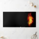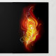 Una brillante pluma de pavo real hecha de fuego y llama sobre fondo negro.