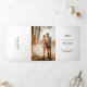 Invitación a la boda moderna y contemporánea, triple, con un diseño sencillo y mínimo, con su monograma inicial y sus nombres y fecha boda en tipografía audaz. La parte de atrás tiene tu foto favorita. Esta minimalista invitación a la boda tipográfica en blanco y negro se puede personalizar a cualquier color que elija en la herramienta de edición de diseño.