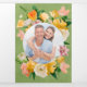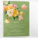 Un arreglo botánico floral brillante y audaz con colores de amarillo, melocotón, rosa y blanco contra un Boda moteado de fondo Apple Green, todo en una sola invitación triple que vienen con tarjetas de respuesta RSVP, Detalles e información y una foto de la pareja. ¡Maravilloso para una boda de primavera, verano o jardín!
