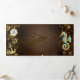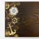 Fondo de madera marrón con mar, cresta mecánica, volante antiguo, ancla dorada y varios engranajes de oro y latón. Estilo Steampunk.