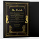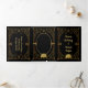 Hermosa invitación de boda Art Neouveau o Deco, con fuentes doradas falsas y Pavos reales, Caballito de mar, Frascos y León en un fondo negro. Perfecto para un lugar de boda elegante y nocturno al estilo Gatsby, años 20, Flapper, prohibición, años 20 rugientes. Invitaciones de boda todo en uno plegables en tres partes que incluyen tarjetas de respuesta RSVP, detalles e información y una foto de la pareja.