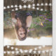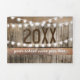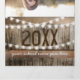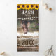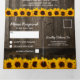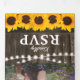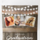 Una invitación trifoldar para fiesta de graduación country rústica 2 en 1 que presenta un fondo de barril de madera rústica, luces de cadena brillantes, girasoles amarillos brillantes, fotos del graduado, el año de la clase, detalles de la celebración de graduación y una tarjeta postal de respuesta para que tus invitados la corten y la envíen de vuelta.