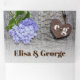 Hidrangea azul y corazón en madera rústica triple tipografía invitación de boda con iniciales. Muestra un corazón metálico de oxidación marrón con iniciales clavadas en tablero de madera gris templado y una flor de horangea azul. Tiene mucho espacio para los detalles de tu boda y también muestra una foto con las iniciales de la pareja en la parte de atrás.