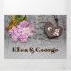 Hidrangea rosa y corazón en madera rústica triple tipografía invitación de boda con iniciales. Muestra un corazón metálico de oxidación marrón con iniciales clavadas en una tabla de madera de grano gris templado y una flor de horangea rosa. Tiene mucho espacio para los detalles de tu boda y también muestra una foto con las iniciales de la pareja en la parte de atrás.