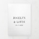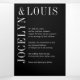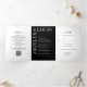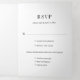 Moderno todo en una invitación de boda triple pliegue con un diseño minimalista en blanco y negro con sus nombres en un gran tipo de letra a lo largo del lado izquierdo y superior. El panel de la tarjeta del recinto tiene un código QR opcional. Puede quitar el código QR en la herramienta de edición de diseño. Este diseño es lo suficientemente sencillo para un boda formal, pero hace una declaración audaz.