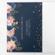 Muestre todos los detalles de su boda con esta elegante invitación de tres veces en una boda con impresionantes flores color agua rosa rubor y azul medianoche sobre un fondo marino bonito y follaje de Relieve metalizado dorado falso y confeti cardíaco, lo que lo hace perfecto para bodas de primavera y verano. Incluye una foto de la pareja feliz, y la invitación a la boda. Los huéspedes pueden cortar fácilmente la postal RSVP y enviarla por correo. Edite fácilmente toda la información con los detalles de su boda utilizando la plantilla proporcionada.