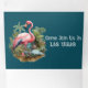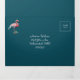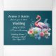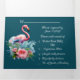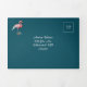 Esta invitación a la boda triple de bonito viene en una pieza con toda la información en una página. Corta la tarjeta de respuesta y vuelve a enviarla a la novia. Texto blanco y elementos sobre un fondo gris azul con flamencos rosados en cada parte de la información y un flamenco en la parte de la dirección.