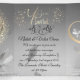 panorama de naturaleza en blanco y negro y fondo negro degradada y foto de pareja rodeada de palomas y dos corazones unidos con anillos con dos palomas dentro los corazones y un toque de brillo en los dos laterales del texto y por la parte exterior un fondo negro con purpurina y decoración estilo oriental .