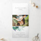 Nueva invitación botánica en un diseño de madera blanca encalada con vegetación. El flap exterior central muestra la foto de tu pareja. Los detalles se establecen en una tipografía de escritura de moda con un tipo de letra serif tradicional. Una frontera de follaje acuático enmarca la información del evento en tonos turquesa, lavanda y verde. Personalice cada solapa con los detalles de su boda, la foto y la dirección de retorno. Esta invitación es perfecta para la primavera, el verano, las bodas de campo o los bodas con temática de jardín. Para ver más suites de invitación a boda impresas con acuarela, visite www.zazzle.com/vginvites