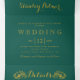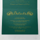Marco floral de oro vintage con iniciales en la invitación a la boda de tres veces verde. Los elementos de esta invitación a la boda son el hermoso marco de oro vintage hecho de hojas de acanto y flores con tus iniciales y los tipos de letra sobre fondo verde.