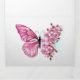 Arreglo floral de mariposa rosa con flores japonesas de cerezo rosadas sobre fondo blanco.