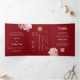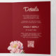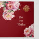 Esta elegante invitación a una boda china bilingüe incluye peonías acuarelas y un símbolo de doble felicidad dorado sobre un fondo rojo oscuro. Nombres de novias y novios en un elegante guión escrito a mano. Invitación a la boda o a la ceremonia del té en China. Con un texto chino tradicional en el medio y un texto detallado con un escandaloso código qr en el lado derecho de la invitación a la boda.