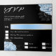 Un bonito diseño todo en uno, lujoso y de cristal, con un traje de bolas diamante de imitación azul bonito, sobre un fondo negro con delicadas flores de rosa floral y bordes de esquina plateados. La tercera parte de abajo tiene una tarjeta de respuesta desgarradora con dirección rsvp personalizada y opciones de comida para que sus invitados completen. Son ideales para una quinceañera; ducha de novias; cualquier cumpleaños de edad o un evento especial para celebrar a la mujer. Personalice la redacción; el color de fondo y agregue su propia foto para hacerla única.