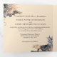 Un bonito y lujoso diseño todo en uno con mariposas de perlas que coquetean con un fondo naranja de melocotón pastel con rosas negros de carbón rodeados de falsas alfileres plateadas en los bordes de la esquina. El centro tiene una foto en color para la fotografía de la pareja de novias y está flanqueado a la izquierda con detalles para la ceremonia del boda y a la derecha, una tira de R.S.V.P para que los invitados la completen y regresen. Este diseño floral hecho a medida es ideal para bodas de verano y primavera o de campo o de bosques al aire libre.