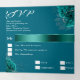 Un bonito diseño todo en uno, lujoso y de cristal, con un traje de bonito diamante de imitación verde azulado sobre un fondo azul verde azulado oscuro con delicadas flores de rosa floral y bordes de esquina plateados. En la parte central hay una plantilla de fotos para la hermosa imagen del chica de cumpleaños y en la parte inferior hay una tarjeta de respuesta al desgarro con dirección rsvp personalizada y opciones de comida para que los huéspedes la completen. Son ideales para una quinceañera; ducha de novias; cualquier cumpleaños de edad o un evento especial para celebrar a la mujer. Personalice la redacción; el color de fondo y agregue su propia foto para hacerla única.