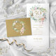 Una elegante invitación de aniversario de bodas de oro 50º todo en uno con un bonito garland floral de rosas y tipografía dorada chic. La invitación incluye los detalles de su celebración y una tarjeta RSVP desmontable. Diseñado por Thisisnotme©