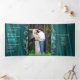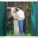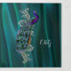 Elegante invitación a la boda triplicada realizada en un verde azulado estilo satinado, con gráficos de platería floreciente y un pavo real colorido, en el frente. El centro interior presenta una franja fotográfica personalizado para la foto de la novia y el novio y el frente de la invitación tiene los monogramas de la novia y el novio. Personalice todas las áreas de texto con la información de su boda.