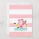 Una divertida y festiva invitación de despedida de soltera con un flamenco rosa rodeado de flores tropicales de hibisco, flores de plumeria y frondas de palma exuberantes en un fondo de acuarela brillante. El diseño juguetón inspirado en la isla es perfecto para una celebración de verano o destino. El reverso presenta una franja rosa y blanca con acento floral tropical. Todo el texto es totalmente editable para su evento.