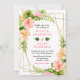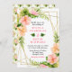 This fun and whimsical wedding invitation features watercolor pink and orange hibiscus flowers, monstera leaves and foliage on a gold geometric frame. The text combines handwritten script and serif fonts for a stylish and modern look. This is perfect for a spring or summer rustic wedding.
