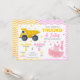 Get ready for the perfect mix of big wheels and twirls with this adorable Trucks & Tutus birthday invitation! Featuring a bright yellow construction dump truck on one side and a sweet pink ballet tutu with matching ballet slippers on the other, this design is made for a fun and unique shared celebration.