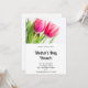 Invitación a desayunar el Día de la Madre con una hermosa fotografía primaveral que presenta 2 tulipanes rosados y hojas verdes brillantes.