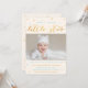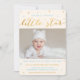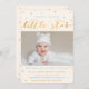 Twinkle twinkle pequeñas estrellas invitaciones para una fiesta de primer cumpleaños para un niño, con una foto personalizado de estrellas de bebe y azul y oro contra un simple y sofisticado fondo crema. "¡Twinkle, pequeña y brillante estrella, de un año es lo que eres!" está en oro y azul, con detalles de la primera fiesta de cumpleaños debajo. También puedes las cartas como invitaciones de primer cumpleaños.