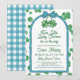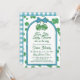 Are you about to welcome two little lucky charms into your life? This blue and green girl twins baby shower invitation has a pair of four-leaf clovers tied with a blue bow. The St Patrick's Day baby shower invitation wording is framed by a blue arch. The background features a matching clover pattern, all in a charming hand-drawn style.