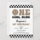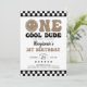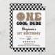 ¡Celebra el gran hito de tu pequeña con esta grandiosa invitación de primer cumpleaños! Con una cara tan alegre que contrasta con un fondo blanco y limpio, este diseño combina a la perfección un ambiente moderno con un toque retro. El audaz borde de cuadros negros y blancos añade un toque divertido y elegante, que le da un aire fresco inspirado en los años 70.