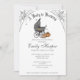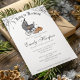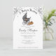 Un bebé está preparando la invitación de Baby Shower de Halloween en blanco con un diseño pintado a mano. Cuenta con carruaje antiguo para bebés, cuervo, caldero burbujeante, gorra de brujas, calabazas y telarañas. El reverso presenta un color gris oscuro y sólido.