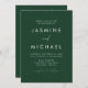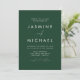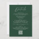 Invitaciones a bodas todo en uno sencillas y elegantes con un guión blanco y manuscrito mezclado con letras modernas en un fondo de color verde cazador. Personalice la parte delantera de la invitación a la boda minimalista con su nombre y detalles de boda. Personalice la parte posterior de la invitación con detalles del boda, como información de recepción, alojamiento de hotel, instrucciones RSVP y sitio web del boda. Agregue el enlace deseado del sitio web del boda a la plantilla de código QR proporcionada para que sus huéspedes puedan ver fácilmente RSVP en línea y obtener información adicional sobre el boda. Las invitaciones nupciales "todo en uno" son la elección perfecta para los bodas modernos.