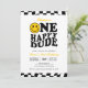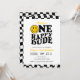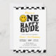 Un tipo feliz sonrisa ondulada se enfrenta a la invitación de primer cumpleaños.