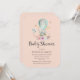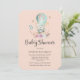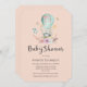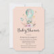 Invitación a una ducha de bebé con "baby ducha" escrita a mano en un moderno estilo. Diseñado con un encantador ilustracion de un conejito de bebés en un globo aerostático decorado con corazones, una cinta, flores y mariposas.