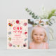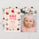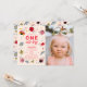 Carta de invitación a la fiesta de primer cumpleaños del chica Cute con ilustracion de ladybugs con flores silvestres. El texto dice "nuestro chica es UN bicho lindo". Puede añadir una foto a esta invitación.